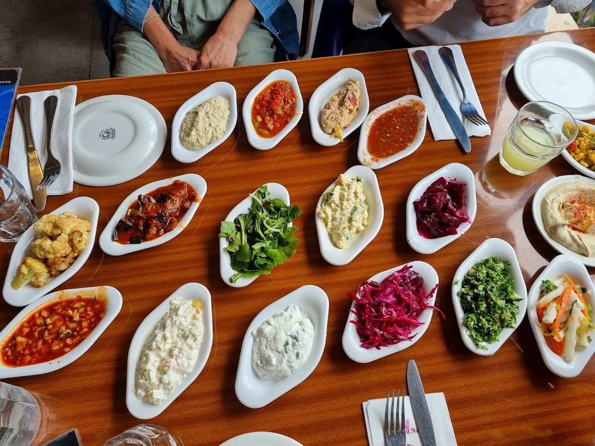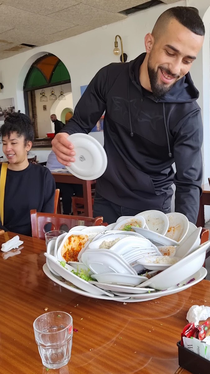 Nice place to eat overlooking the beach in Jaffa. Shaded outdoor seating with a sea breeze or indoor seating is available. As soon as you sit down the waiters bring water, lemonade and enough small salad plates to cover the table as well as fresh, hot laffa breads. The small plates include a very good hummus, roasted cauliflower, roasted cauliflower in tehina, several variations of eggplant salad, Turkish salad, a great tabouli salad and more. The salads are quite filling and there are refills, often you don’t even have to ask. The main dishes are fine. I had the kebab and it was above average and generous. I’ve also had the lamb skewers and they were a bit less generous but also tasty. The prices start at 90 shekels for the most basic mains including the salads. The kids plates with a smaller serving are a good value at 55 shekels. A nice touch at the end or the meal is a cup or coffee or mint tea with a piece of baklava. On occasion they spoil the kids with a surprise dessert too.